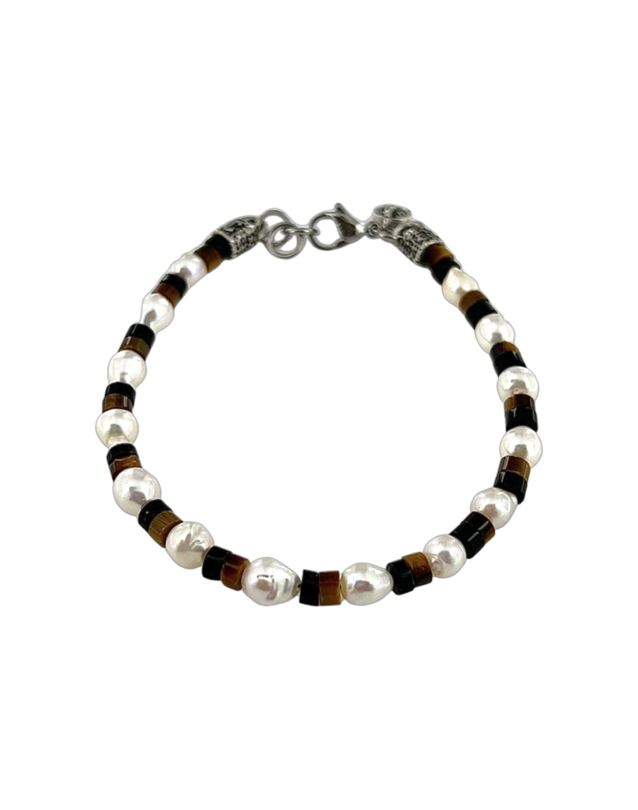 BRACCIALE PERLE e PIETRE. L'eleganza delle Perle Irregolari, alternate alla bellezza delle pietre Onice - Occhio di Tigre, con il particolare taglio a Dischetto, creano un Bracciale per nulla scontato , da indossare in qualsiasi momento della nostra Giornata