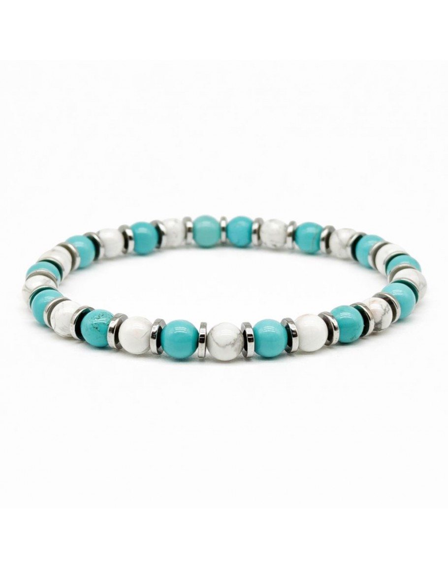 BRACCIALE Elastico, Aulite Turchese e Agata Bianca . Raffinate le Tonalita' delle Pietre Aulite Turchese - impreziosito dalla luminosita' della Pietra TURCHESE , alternati a separatori in Ematite Argento , Fine indossato nei momenti piu' belli delle nostre Giornate.