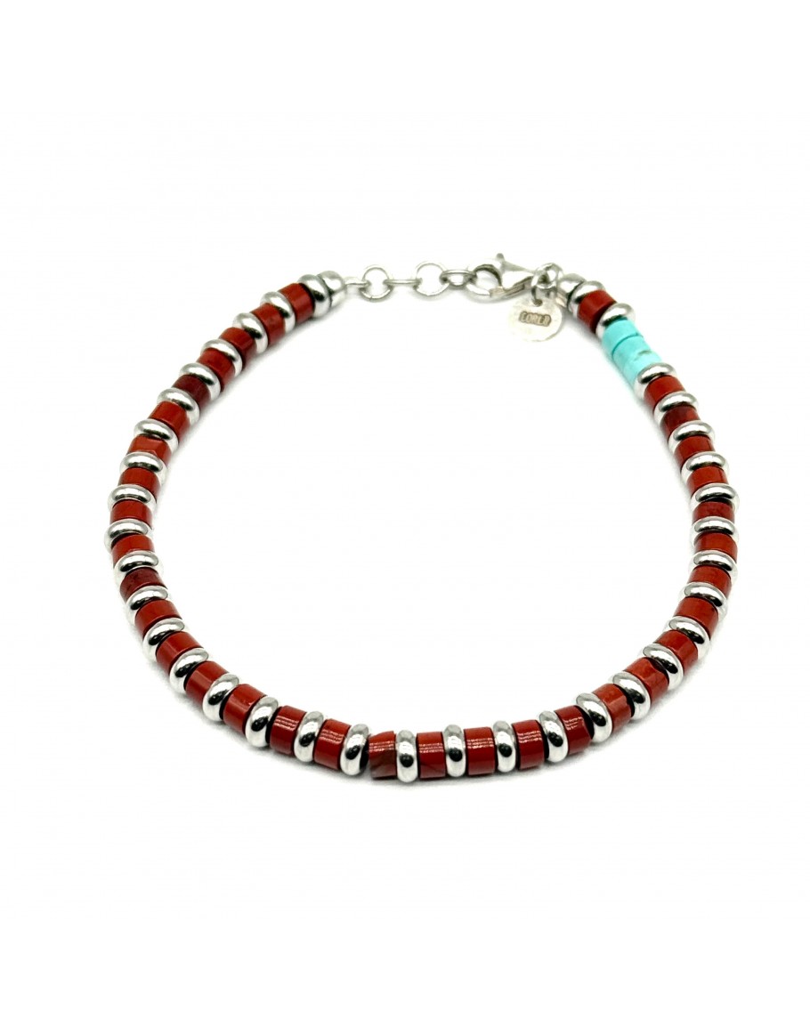 Un accessorio raffinato dal design essenziale, perfetto per aggiungere carattere a qualsiasi look. Questo bracciale è realizzato con pietre naturali, intervallate da elementi metallici argentati in acciaio che creano un contrasto moderno e sofisticato. Un dettaglio in tonalità turchese dona un tocco distintivo e originale.