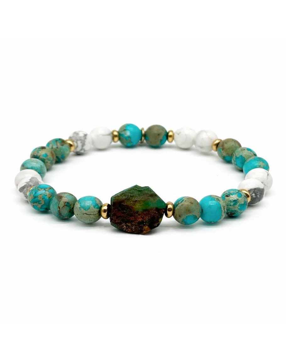 Bracciale elastico realizzato con una raffinata combinazione di pietre naturali: magnesite blu, aulite striata e crisocolla esagonale, arricchito da eleganti distanziali color oro.