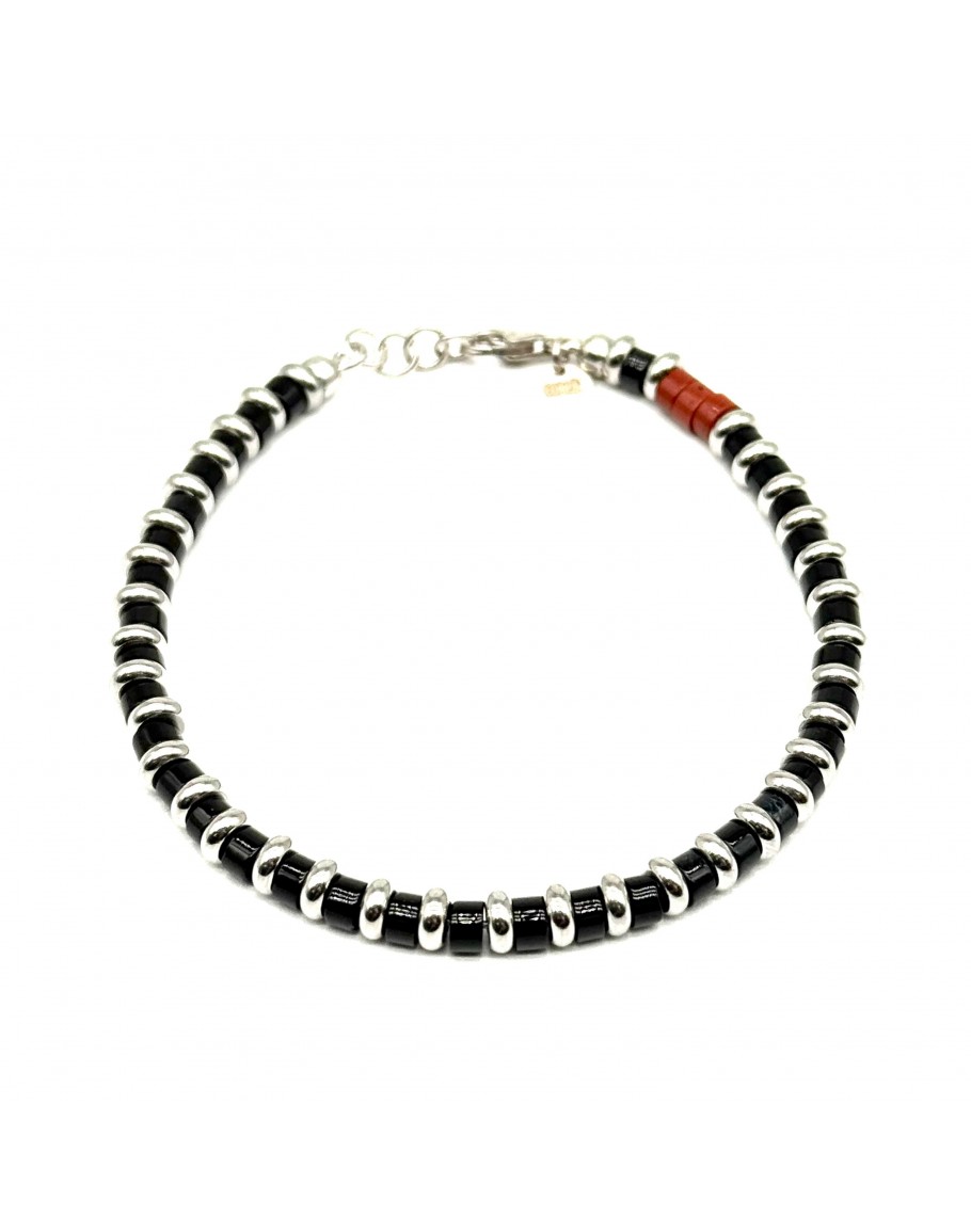 Un accessorio raffinato dal design essenziale, perfetto per aggiungere carattere a qualsiasi look. Questo bracciale è realizzato con pietre naturali, intervallate da elementi metallici argentati in acciaio che creano un contrasto moderno e sofisticato. Un dettaglio in tonalità corallo dona un tocco distintivo e originale.