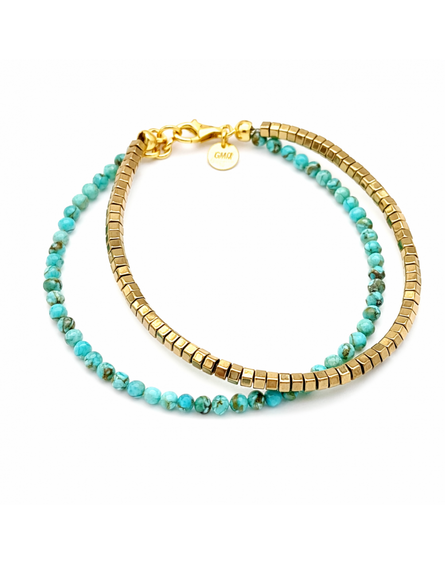 BRACCIALE PIETRE SPINELLI TURCHESE - PASSANTI ORO. Due Fili Pietre Spinelli Turchese ed Ematite Oro, un Bracciale Particolare, unisce l'eleganza delle Pietre ,alla linea Stilosa delle Ematite. Rende unico ogni momento della nostra Giornata, indossato al polso.