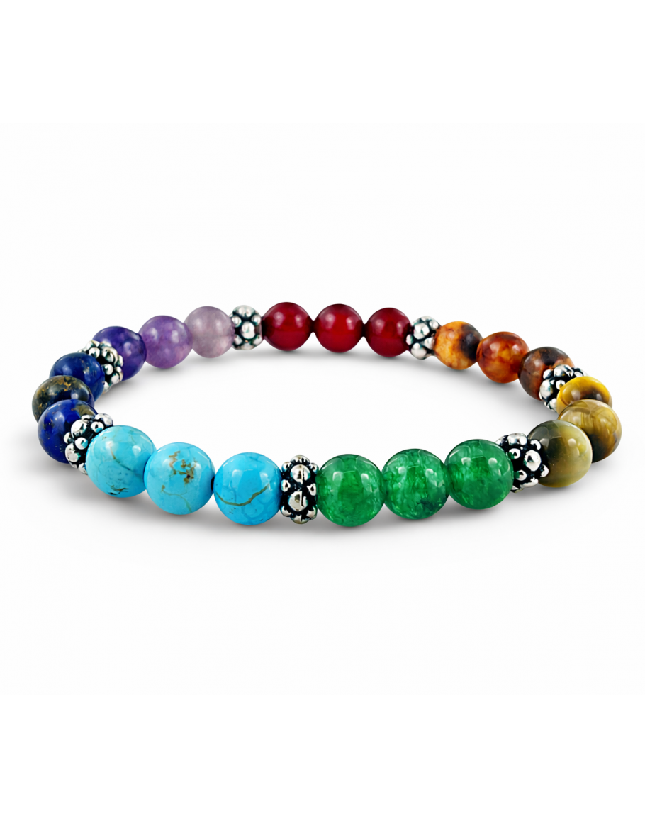 Chakra-Armband, farbige Steine, abwechselnd mit sieben fein gearbeiteten Abstandshaltern, um die Energie des Chakras immer am Handgelenk bei uns zu tragen.