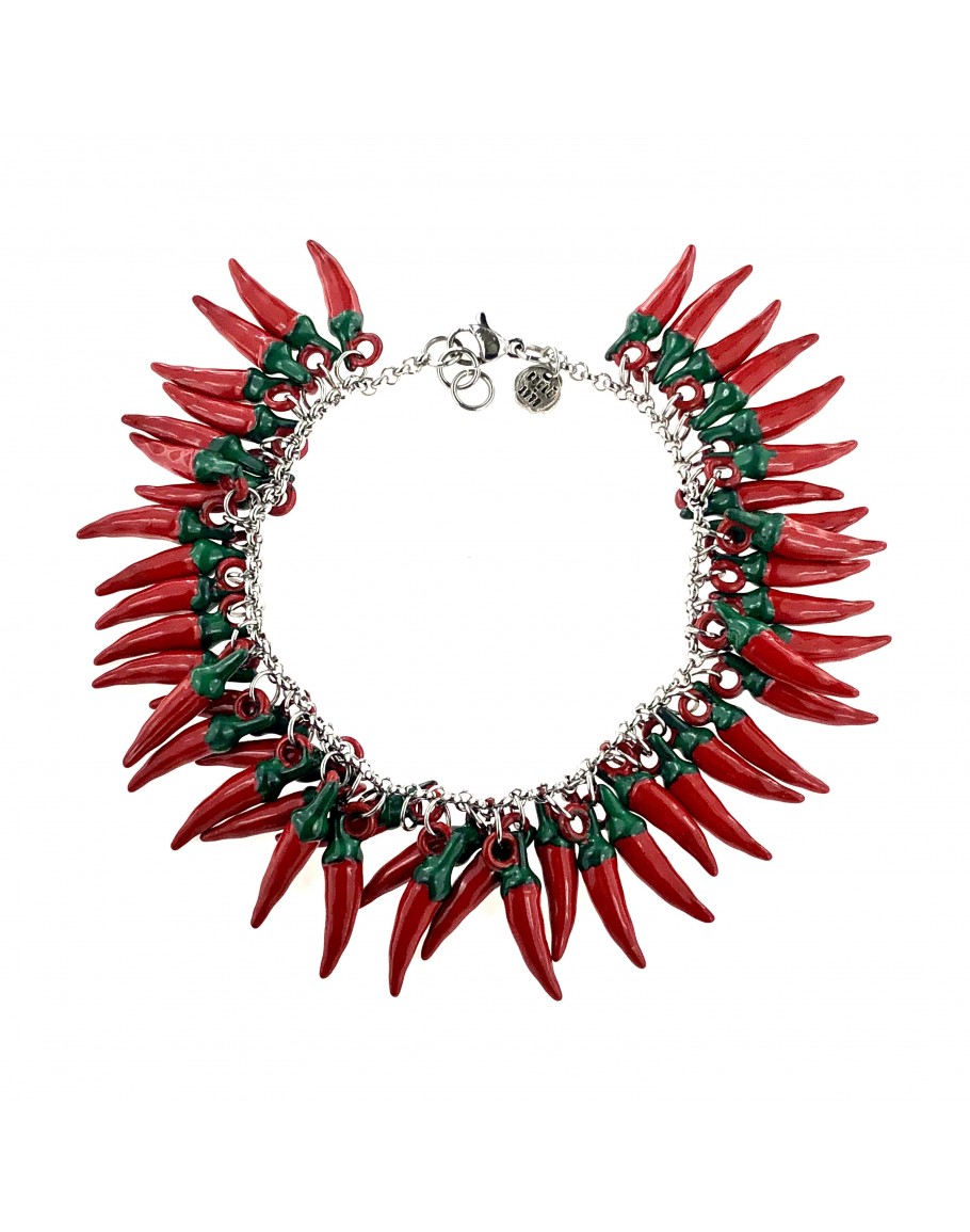 CHILI-PFEFFER-ARMBAND. „The Role“-Kette aus Stahl, verziert mit emaillierten CHILI PEPPER-Anhängern. „Vorsicht vor schönen Frauen und Chili“. Eine Explosion des Salento am Handgelenk getragen, um immer so viel Freude bei uns zu tragen.