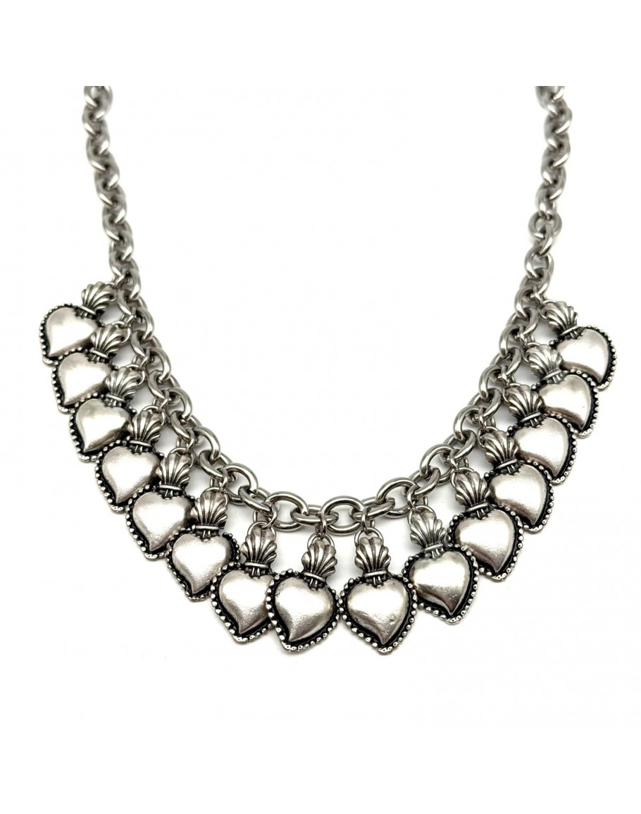 HALSKETTE MIT HEILIGEN HERZEN . Die geflochtene Stahlkette ist mit Anhängern aus heiligen Herzen verziert.