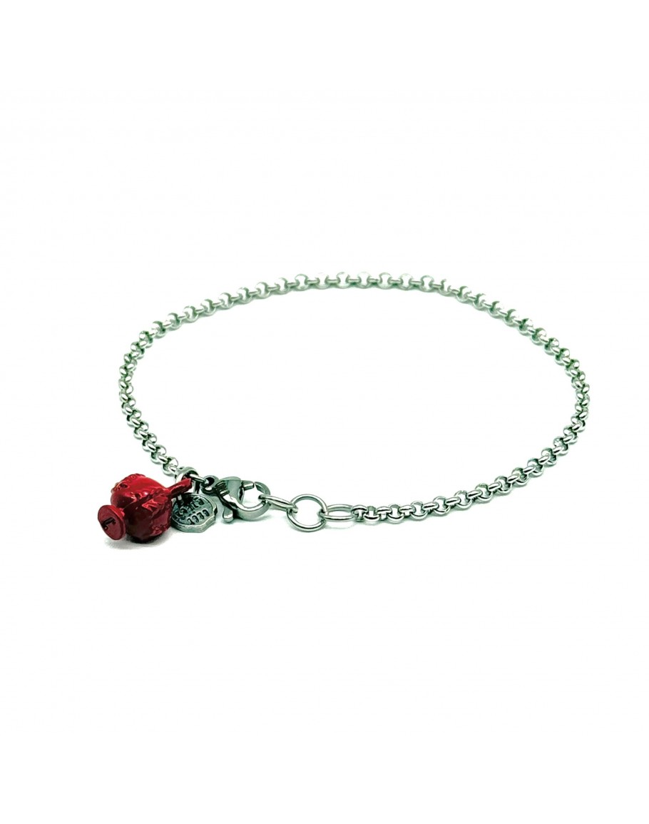 PUMINO Rotes Armband. Die Rolo‘-Stahlkette wird durch einen zarten roten Pumino bereichert, ein Symbol für gutes Omen, Wohlstand. Fein und zart am Handgelenk getragen, um es in jedem Moment des Tages bei uns zu tragen
