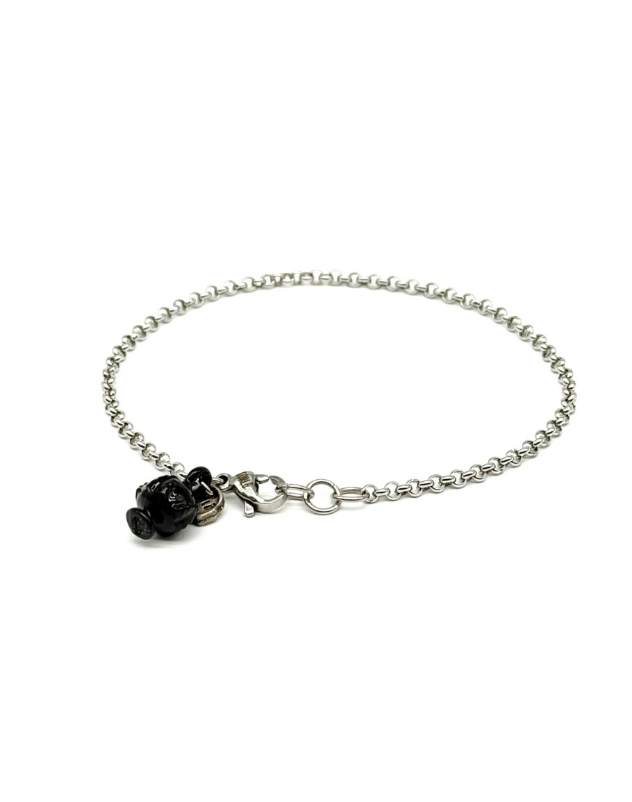 Schwarzes PUMINO-Armband. Die Steel Rolo‘-Kette wird durch einen zarten schwarzen Pumino bereichert, ein Symbol für gutes Omen, Wohlstand. Fein und zart am Handgelenk getragen, um es in jedem Moment des Tages bei uns zu haben