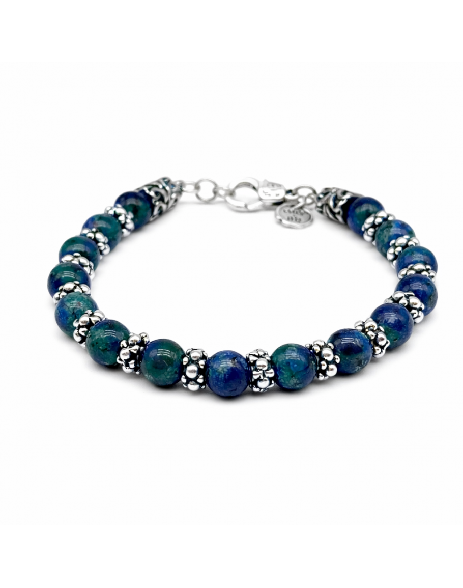 Afghan Lapis Bracelet with Dotted Elements. Made with careful Handcrafted research, with alternating semiprecious stones, with Machined spacers, Rhodium plated in Silver. A Chromatic contrast given by Blue and Green. Elegant Worn on the Wrist.