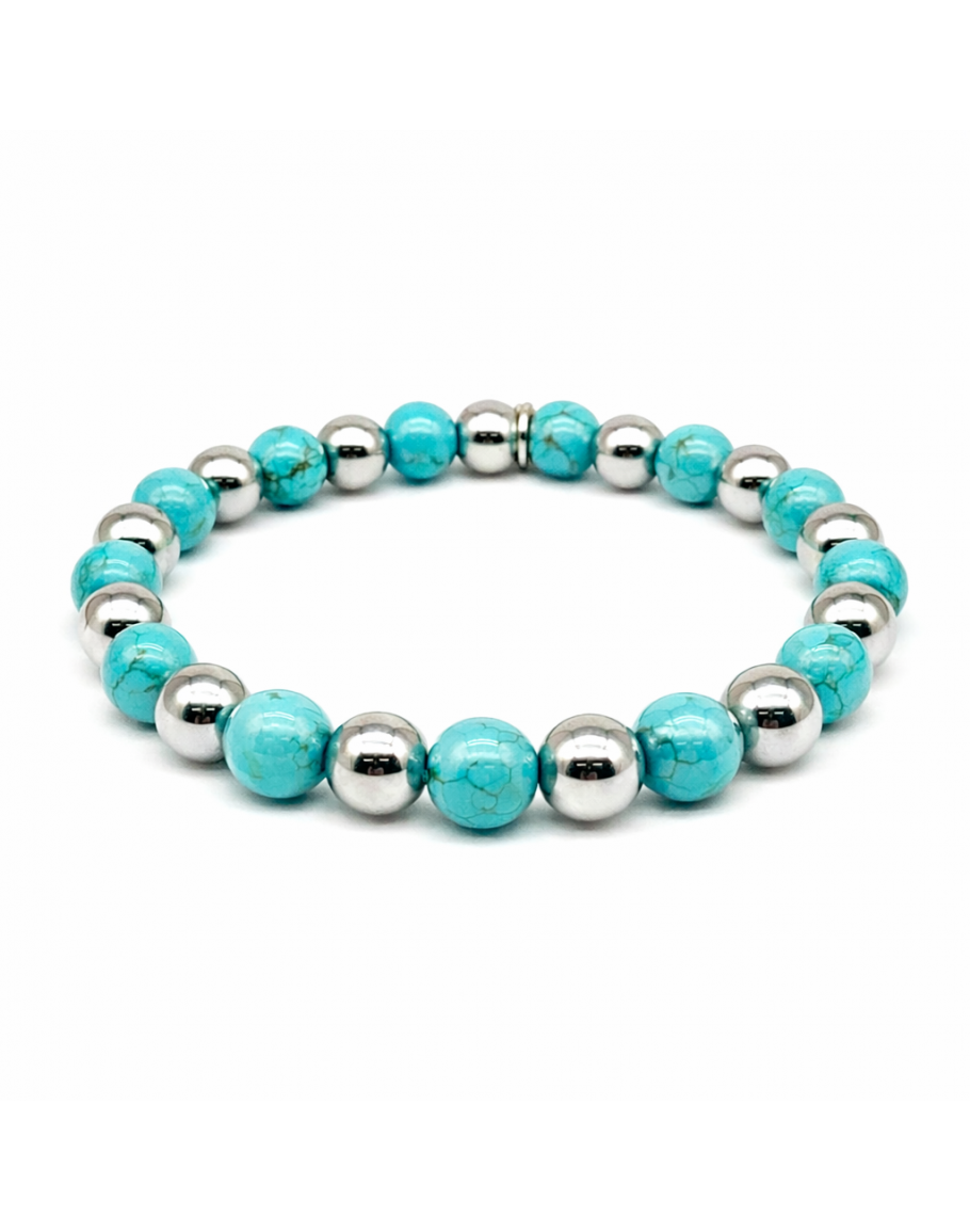 BRACELET Hematite and Turquoise Spheres . Cool and enveloping tones those of the Stone ,alternating with the luminous Hematite spheres. A Touch of Style that accompanies the moments of our Days .