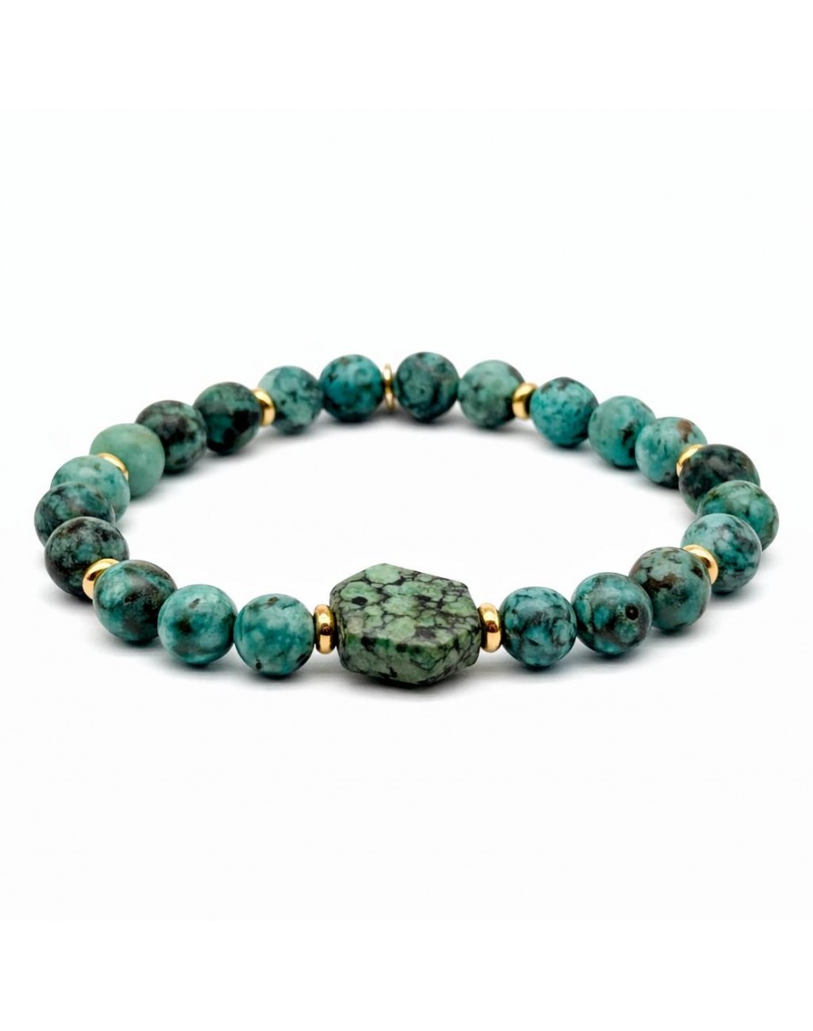 Elegant and refined elastic bracelet made with authentic African Turquoise stones, enhanced with gold-colored spacers for a touch of light and sophistication.
