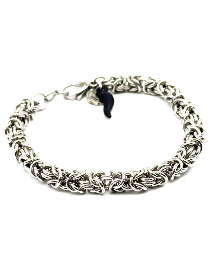 BYZANTINE LINK BRACELET . Particular The interlacing of the Steel chain, made from rings embraced with each other , Captivating worn on the wrist. The Enameled Cornetto pendant inserted into the clasp as a good luck charm.