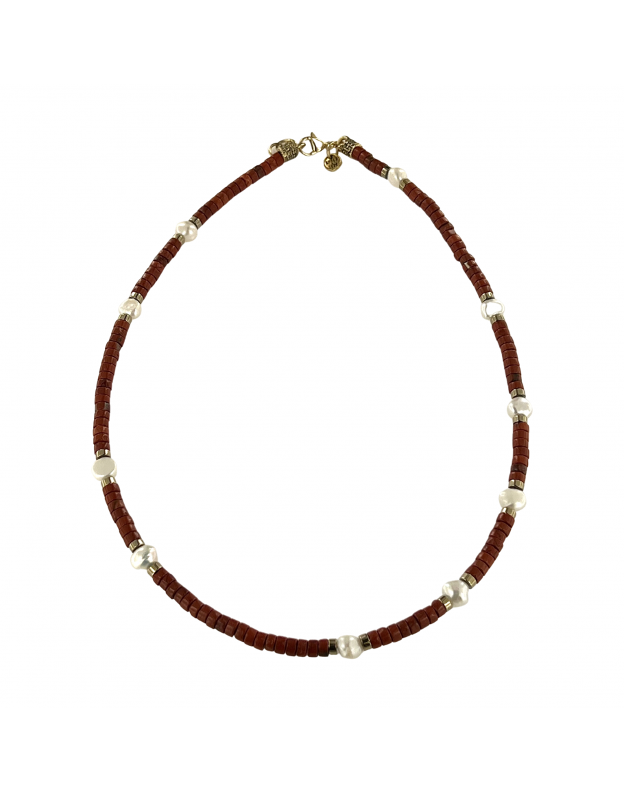 Coral, Pearl and Hematite Rondelle Necklace. The stone with its colors and its nuances create a necklace full of beauty, the effect of the gold loops and pearls is bright, the aesthetic effect around the neck is fine.