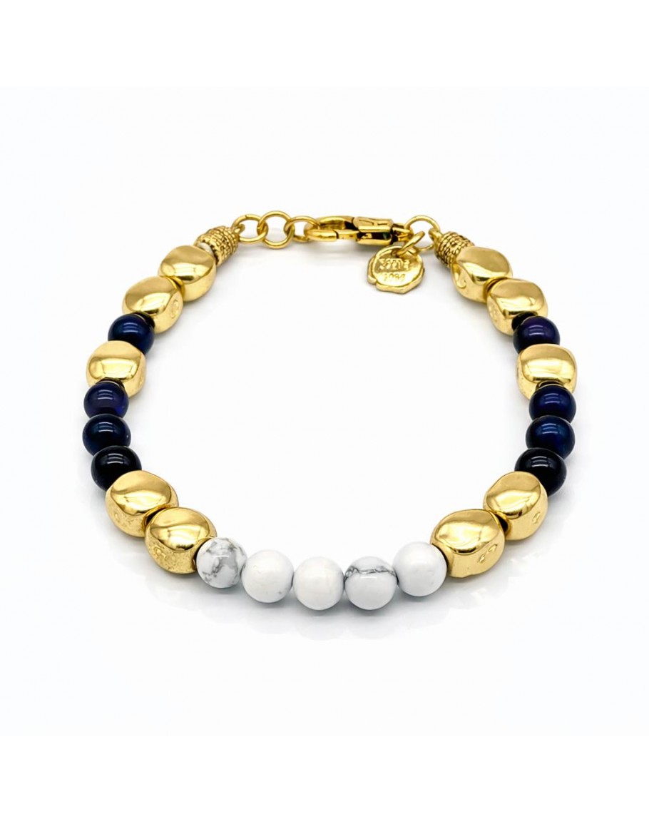 ISLAND LAPIS LAZULI AND WHITE AGATE BRACELET. So much beauty is contained in this bracelet, from the shades of blue of the lapis lazuli to the white of the white agate stones, embellished with gold nuggets. An important and elegant bracelet on the wrist, to be worn in all the important moments of our lives