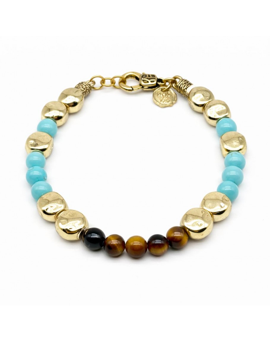 ISLAND TIGER'S EYE and TURQUOISE BRACELET. So much beauty is contained in this bracelet, with the warm and bright shades of the Tiger's Eye and light Blue Tiger's Eye stones, embellished with Gold Nuggets. An important and elegant bracelet on the wrist. To be worn in all the important moments of our lives