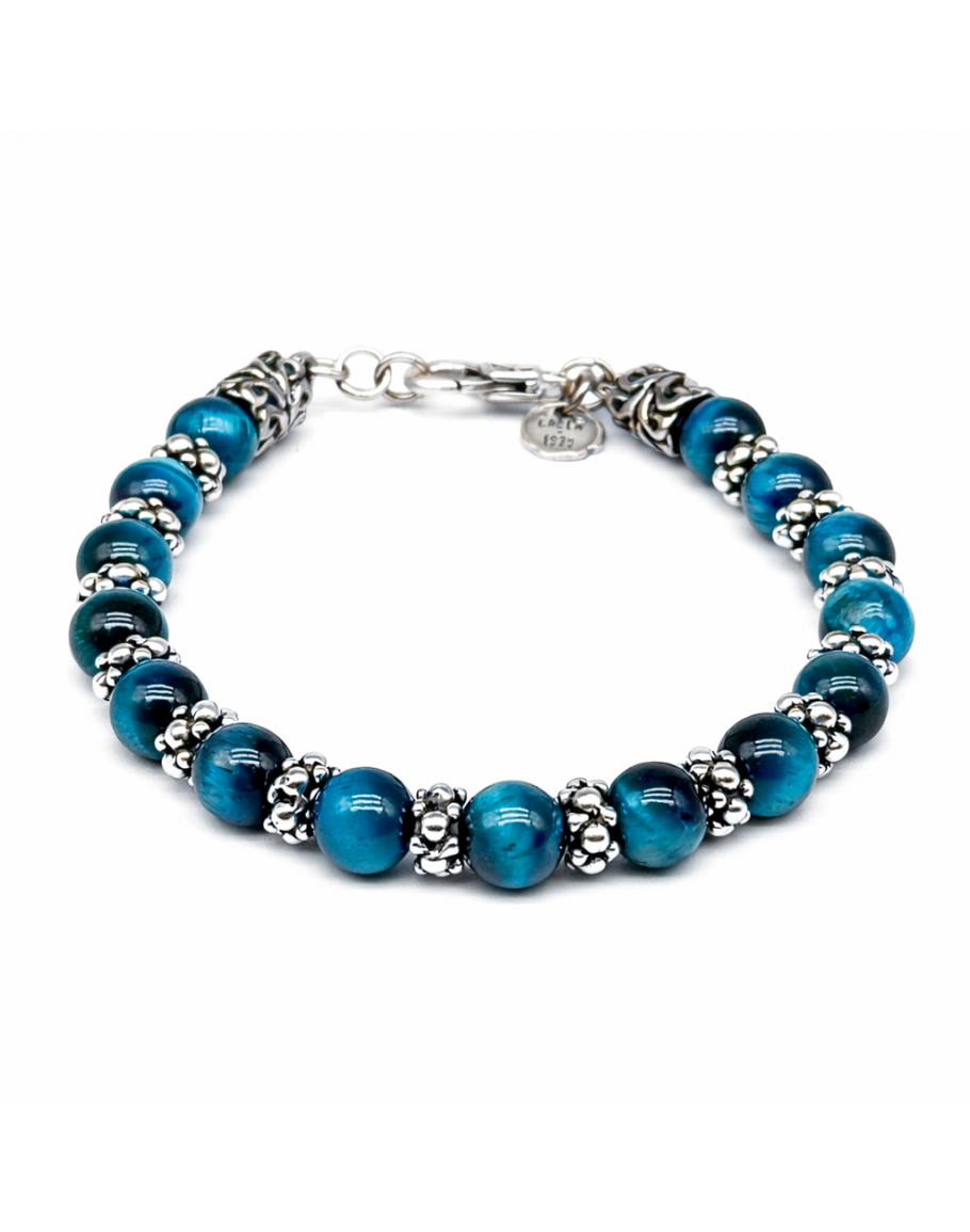 Light Blue TIGER'S EYE STONE BRACELET with Dotted Elements. Made with careful artisanal research, with semi-precious stones alternating with worked, rhodium-plated silver spacers. The Light Blue Tiger's Eye Stone Known for its Properties against any form of evil. A warm, chromatic contrast given by the Blue Light of the Stones. Fine and elegant Worn on the wrist.