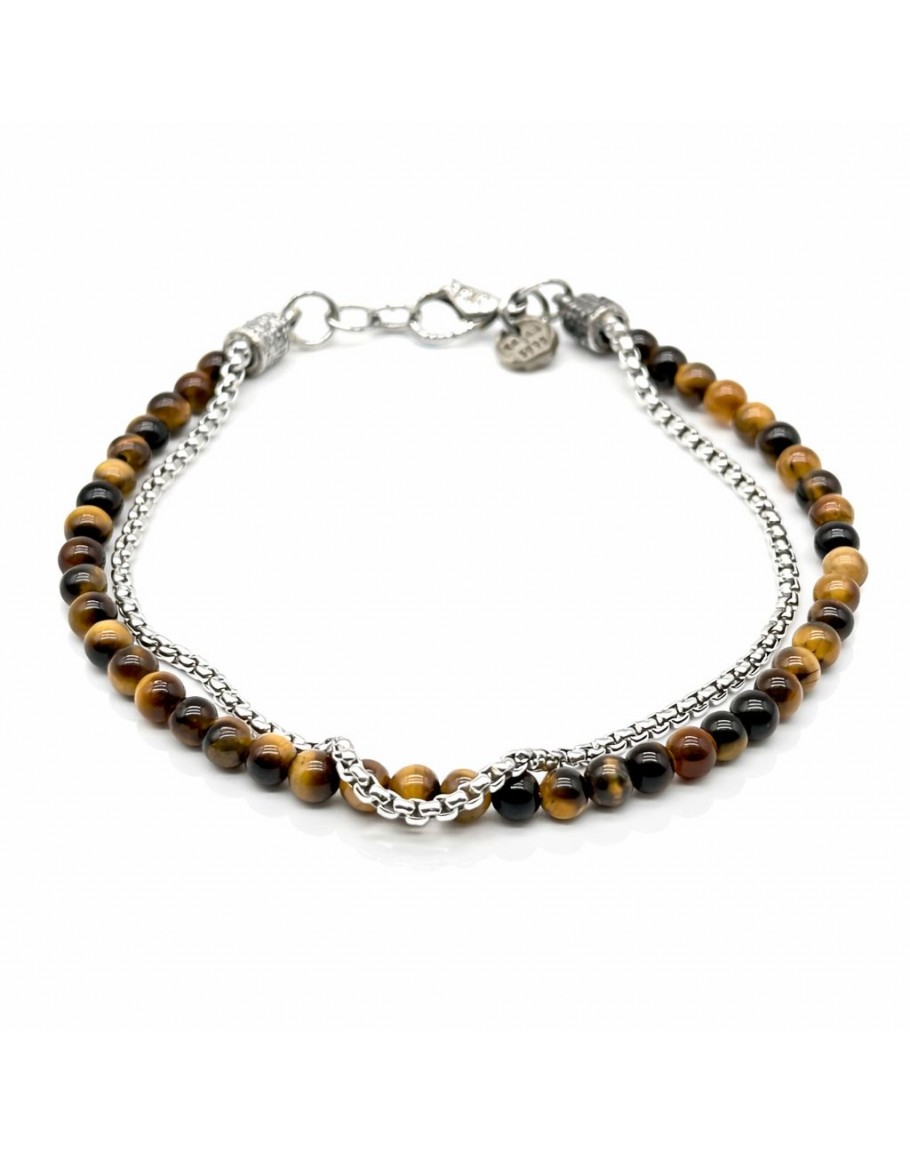 TIGER'S EYE BRACELET. The unique square steel chain, together with the tiger's eye stones, creates a delicate luminous effect worn on the wrist.
