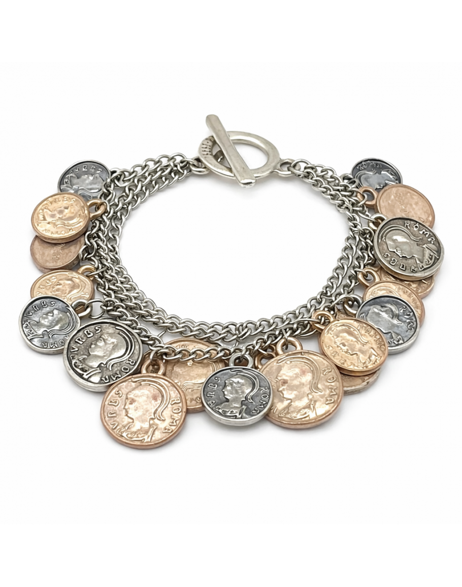 PULSERA DE MONEDAS ROMANAS. "Lo único que tiene dos caras es la Moneda" Cadena Rolo de Acero de Tres Hilos rellena de Colgantes de Monedas de Oro y Plata Romanas, Una Pulsera rica en historia. Suave y envolvente para llevar en la muñeca.
