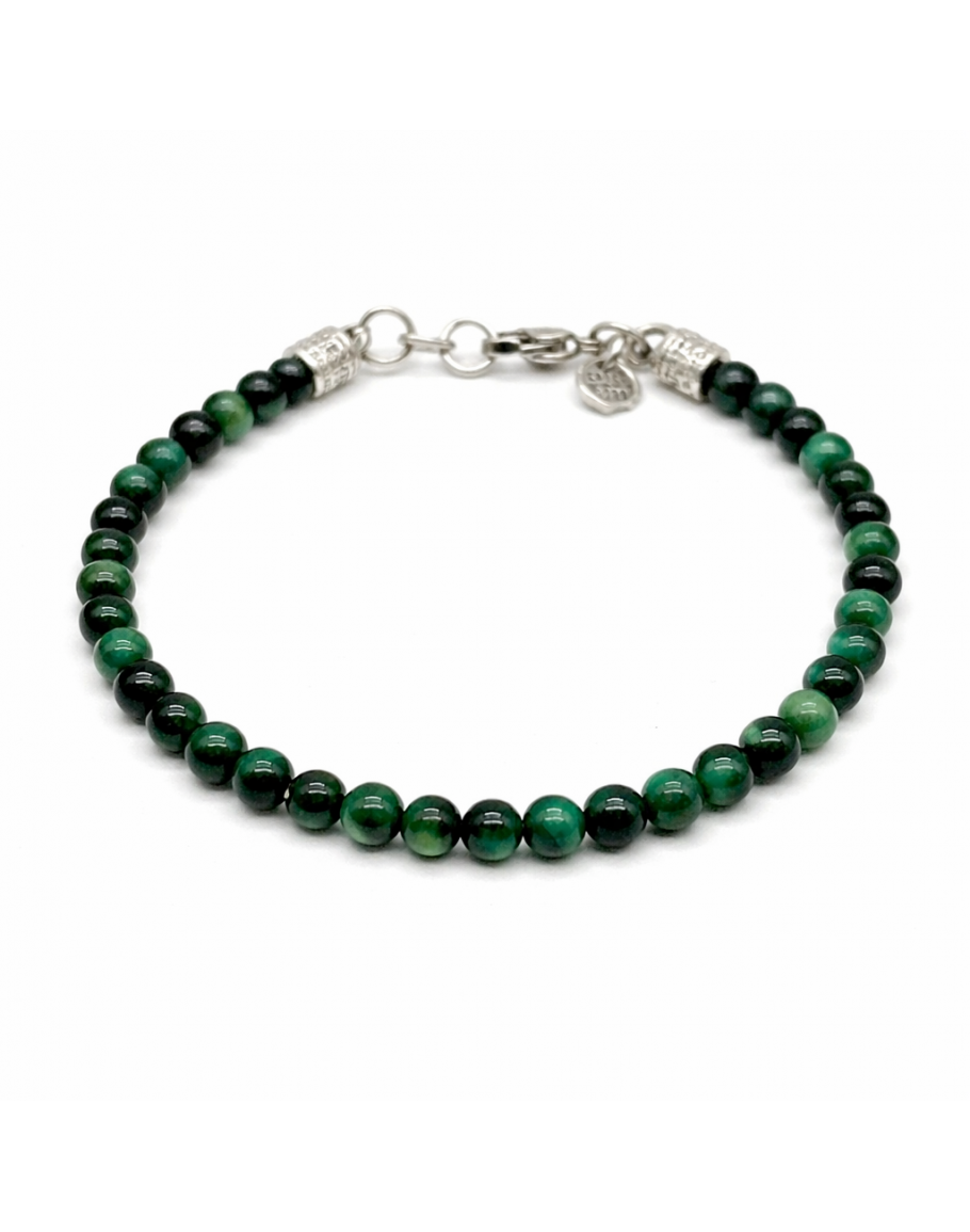 BRACELET EN ŒIL DE TIGRE VERT. Simple et lumineux, tel est l'effet esthétique du bracelet. Il donne une sensation de positivité, de calme, porté au poignet. Les douilles qui fixent le fermoir, réalisées à la main avec des points, sont particulières.