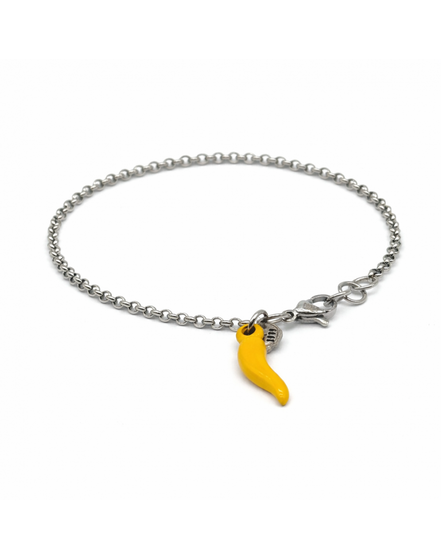 Bracelet CORNET moutarde. La chaîne en acier Rolo' agrémentée d'un maïs émaillé moutarde très délicat, "La fortune est aveugle, mais la gelée voit très bien". Fin et délicat porté au poignet, à emporter avec soi, à chaque instant de notre journée