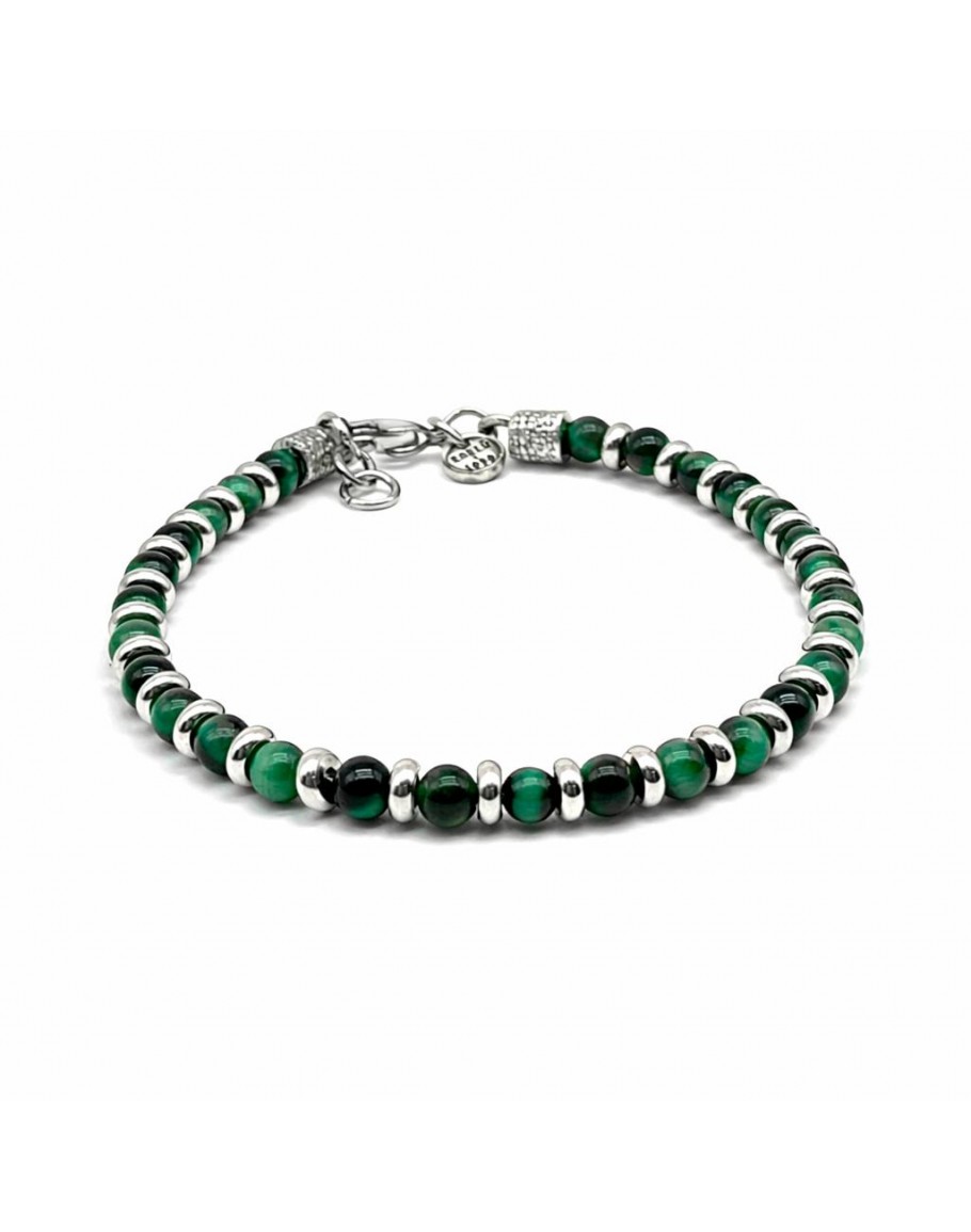 BRACELET EN PIERRE OEIL DE TIGRE VERT avec ESPACEURS. Réalisé avec une recherche artisanale minutieuse, avec la Pierre Oeil de Tigre Vert, connue pour ses propriétés de chasser les mauvaises pensées, de recentrer les énergies positives, de renforcer notre force intérieure, en alternance avec des entretoises en acier, un contraste chromatique enveloppant sophistiqué tenu par. deux buissons fabriqués à la main. Agréable à porter à tout moment de notre journée