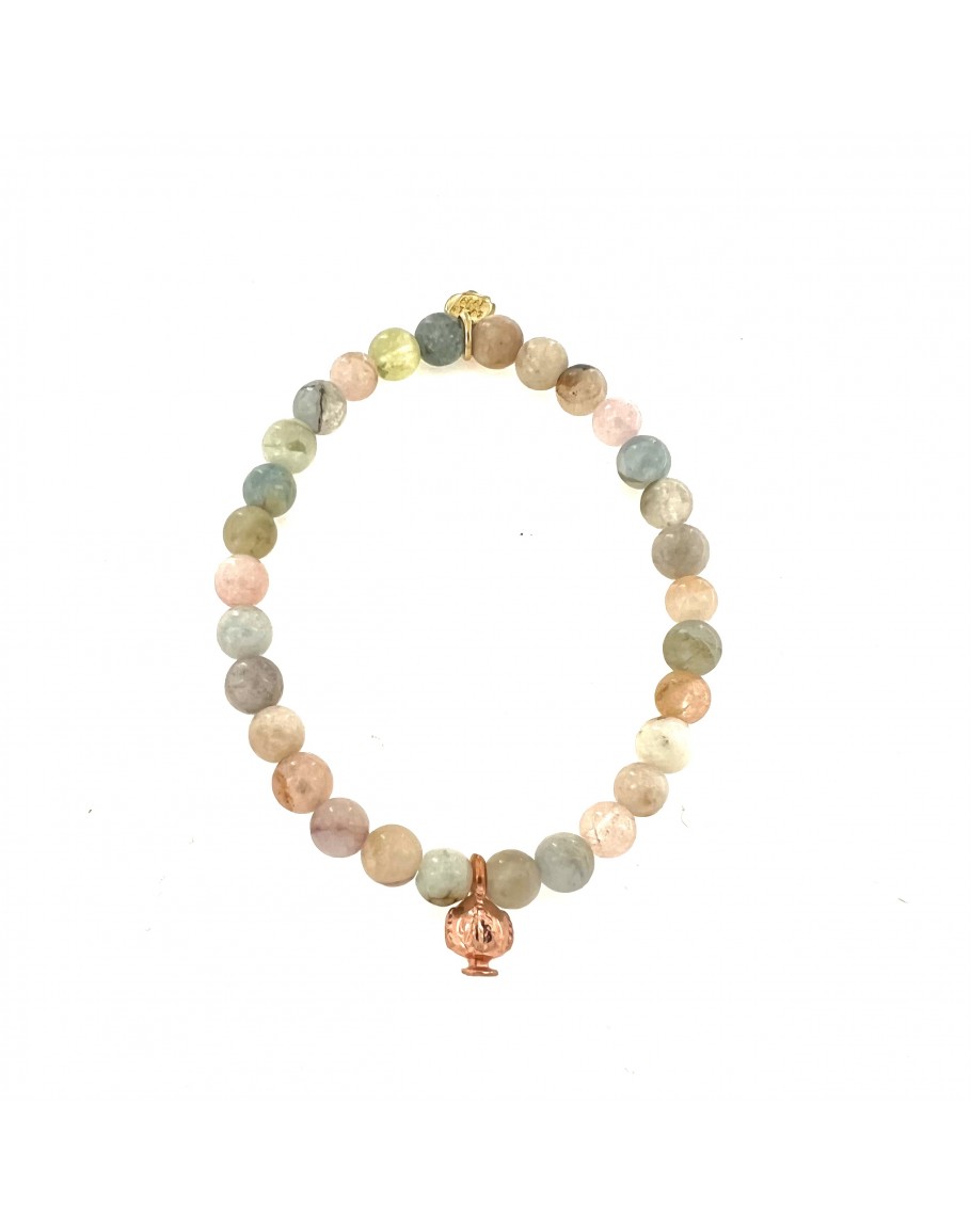 BRACELET Élastique AVEC PIERRE MORGANITE et PUMINO. Réalisé avec une recherche artisanale minutieuse, avec des pierres semi-précieuses, le pendentif PUMINO se distingue par les variantes Or-Or Rose-Argent, Fabriquées à la Main, la Pierre MORGANITE, Connue pour ses Propriétés d'Optimisme et de Positivité. Un contraste de couleurs délicat, compte tenu des veines des pierres. Fin et élégant porté au poignet.